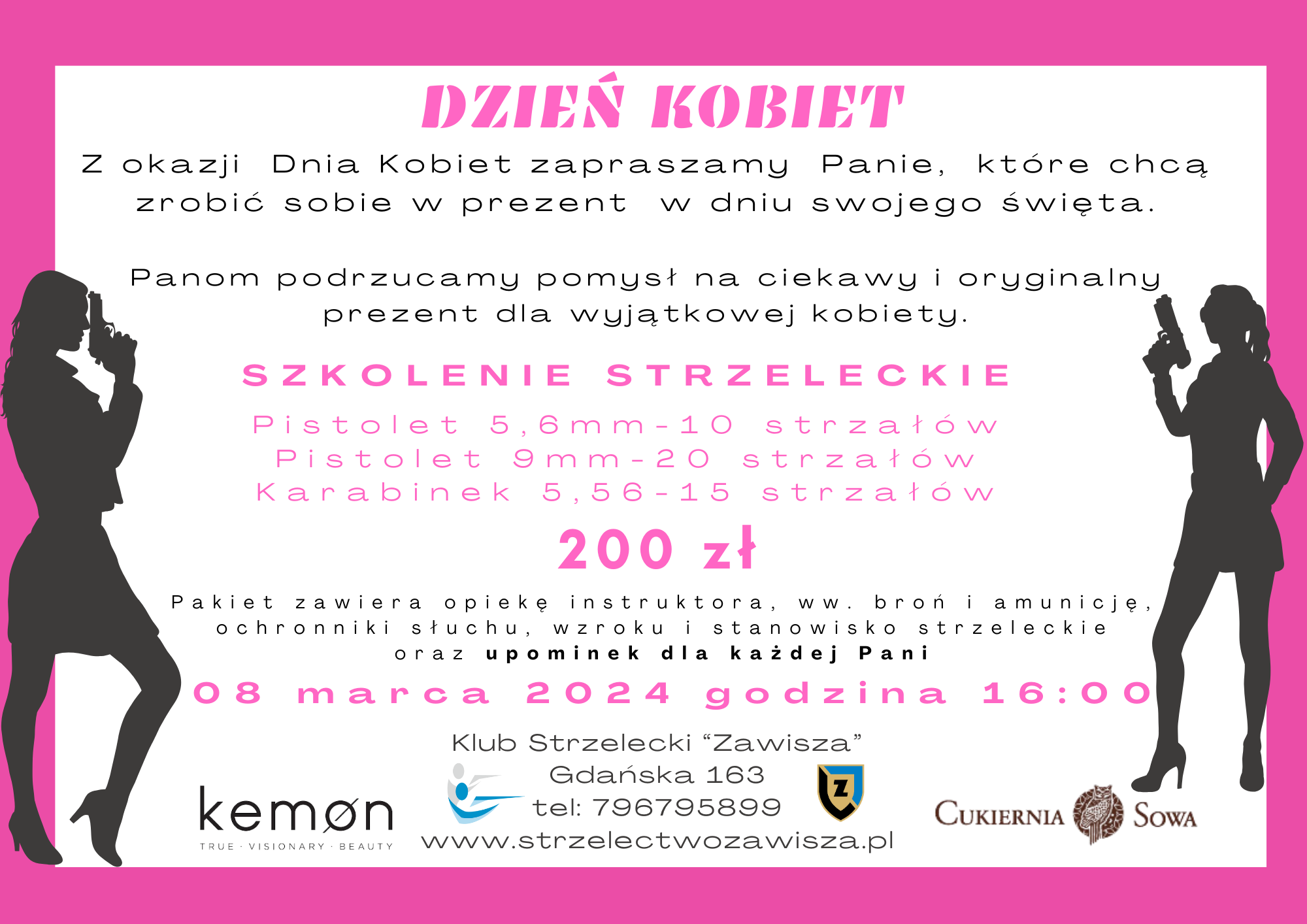 W dniu 08. marca zapraszamy na szkolenie strzeleckie tylko dla Pań podczas, którego bardzo sympatyczny pan instruktor omówi zasady bezpiecznego posługiwania się bronią, wytłumaczy jak ładować broń i właściwie celować. Następnie będziecie mogły poczuć radość ze strzelania z pistoletu i karabinu.