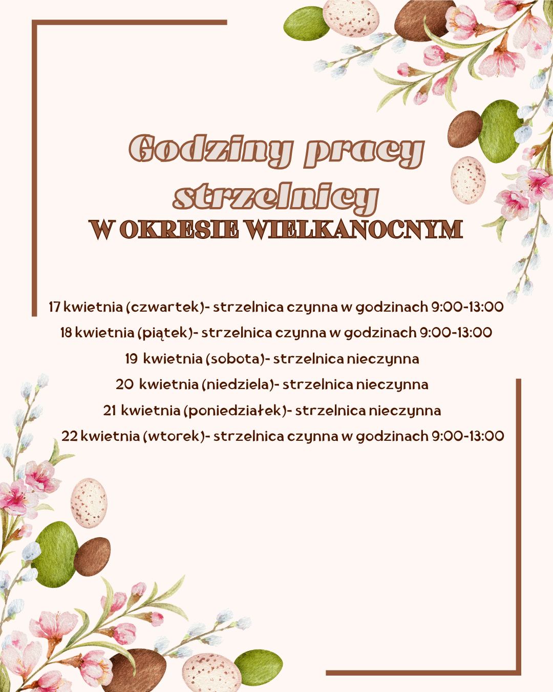 Przedstawiamy plan pracy strzelnicy na okres wielkanocny 17-18 kwietnia strzelnica będzie czynna w godzinach 9:00-13:0019-21 kwietnia strzelnica będzie nieczynna 22 kwietnia strzelnica będzie czynna w godzinach 9:00-13:00 Za utrudnienia przepraszamy.